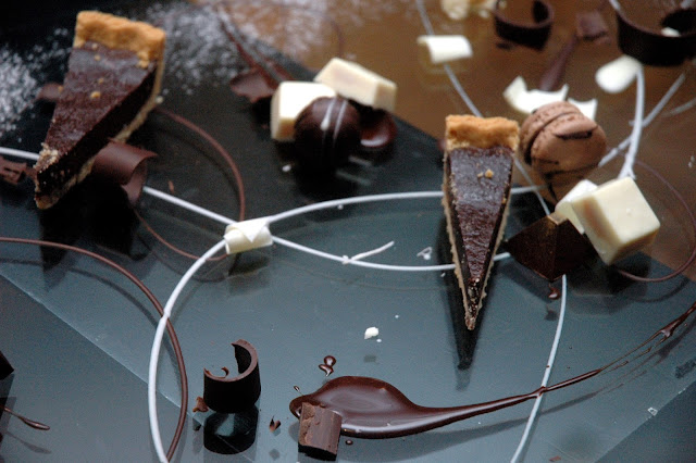 Thin shards of white and dark chocolate are added, as well as more chunks of chocolate, and the chocolate art piece is complete. The performance was entertaining, all the while restraining yourself from grabbing that chocolate praline on the far side.