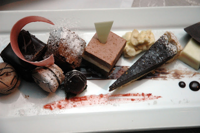 22 Prime's impressive Dessert Buffet, with Assorted Pralines, Chocolate Covered Strawberries, Chocolate Tart, Duo of Chocolate Mousse, Chocolate Creme Brulee, Chocolate Macaroons, Decadent Chocolate Cake, and moist Fudge Brownies. Pure chocolate bliss on glass.