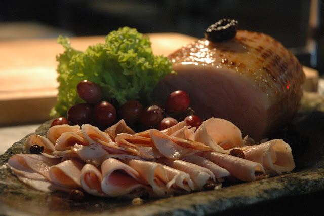 ...and the elegantly plated Honey Glazed Leg of Ham. The mild and delicate notes of the tender ham are complemented by the sweet hint of honey with just a whisper of saltiness to complete the flavors, and you can taste the festive flavors of Christmas with every bite.