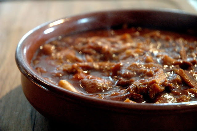 Further down the buffet spread, you'll find the main dishes at Vask's Comida de Navidad, like Callos, a thick and hearty stew with ox tripe, another favorite. Pair it with some crusty bread, or maybe some garlic fried rice, and you've got one serious meal. This one's another personal favorite.
