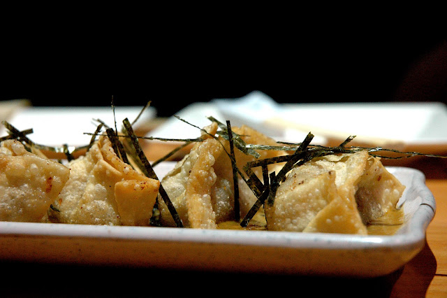 Next, Soy Chicken and Mushroom Gyoza with House Curry, crisp dumplings with a savory chicken and mushroom filling on Izumi's House Curry, topped with strips of nori. The curry combo just adds a whole new dimension of flavor to this familiar starter, and immediately one can sense Chef Him's cool influence in Izumi's kitchen. Crisp, savory and a rich curry binds all the flavors and textures together in this starter.