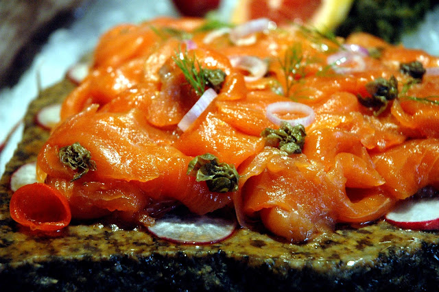 ...heaps of Norwegian Salmon Gravlax with onions and dill...