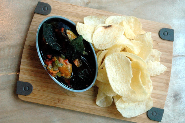 Garde Manger's Curry Smoked Mussels in Extra Virgin Olive Oil combines fresh seafood with a soothing layer of mild heat from the curry, served with a side of chips.