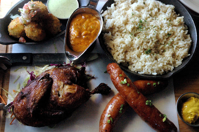 Then, you're just about ready for The Smokehouse Platter (P 1,150), a sumptuous feast for two or three with Smoked Fried Chicken served with Jambalaya Sauce, Char-Grilled Texas Links with a side of mustard, Golden Chipotle Cheese Balls and Rice. It's a feast for two or even three, offering a variety of flavors on a large wooden chopping board.