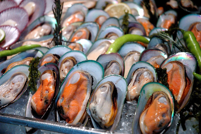 Right beside it is the Fresh Seafood Station loaded with the day's bountiful catch, from plump Mussels...